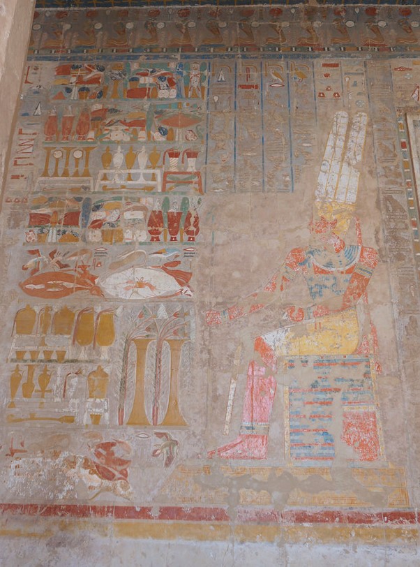 Der Innenraum des Hatschepsut-Tempels beeindruckt heute noch vor allem durch die kunstvollen Wandmalereien, die überall im Tempel zu finden sind und in mühevoller Kleinstarbeit wiederhergestellt wurden. Hier wird auch sichtbar, dass Hatschepsut immer wieder auch als Mann mit dem Pharaonenbart dargestellt wurde.